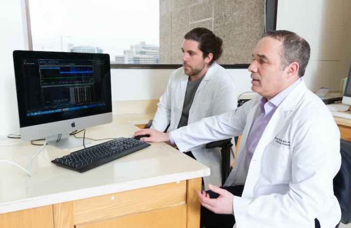 image: Drs. Cody Ruhl, left, and Michael Shiloh assess data from a study that found bacteria that cause tuberculosis may facilitate their own spread by producing a molecule that triggers cough.