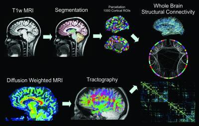 MP-RAGE volumes are segmented into 83 ROIs, which are further parcellated into 1000 cortical and 15 subcortical ROIs. Whole-brain white matter tractography is performed after voxelwise tensor calculation, and the density of fibers that connect each pair of cortical ROIs is used to calculate structural connectivity. T1w = T1-weighted.