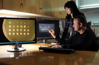 Georgia Tech associate professor Kirill Lobachev and graduate research assistant Yu Zhang review a gel electrophoresis image used for the analysis of repeat expansions, while another monitor shows the growth of yeast colonies.