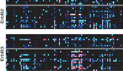 This image shows high-throughput fluorescence polarization maps of interactions with HER2 (above) and HER3 (below).