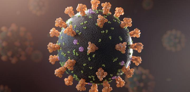 image: This artistic representation of a SARS-CoV-2 virus shows the membrane protein (green) and envelope protein (purple) and the characteristic spike protein (orange).