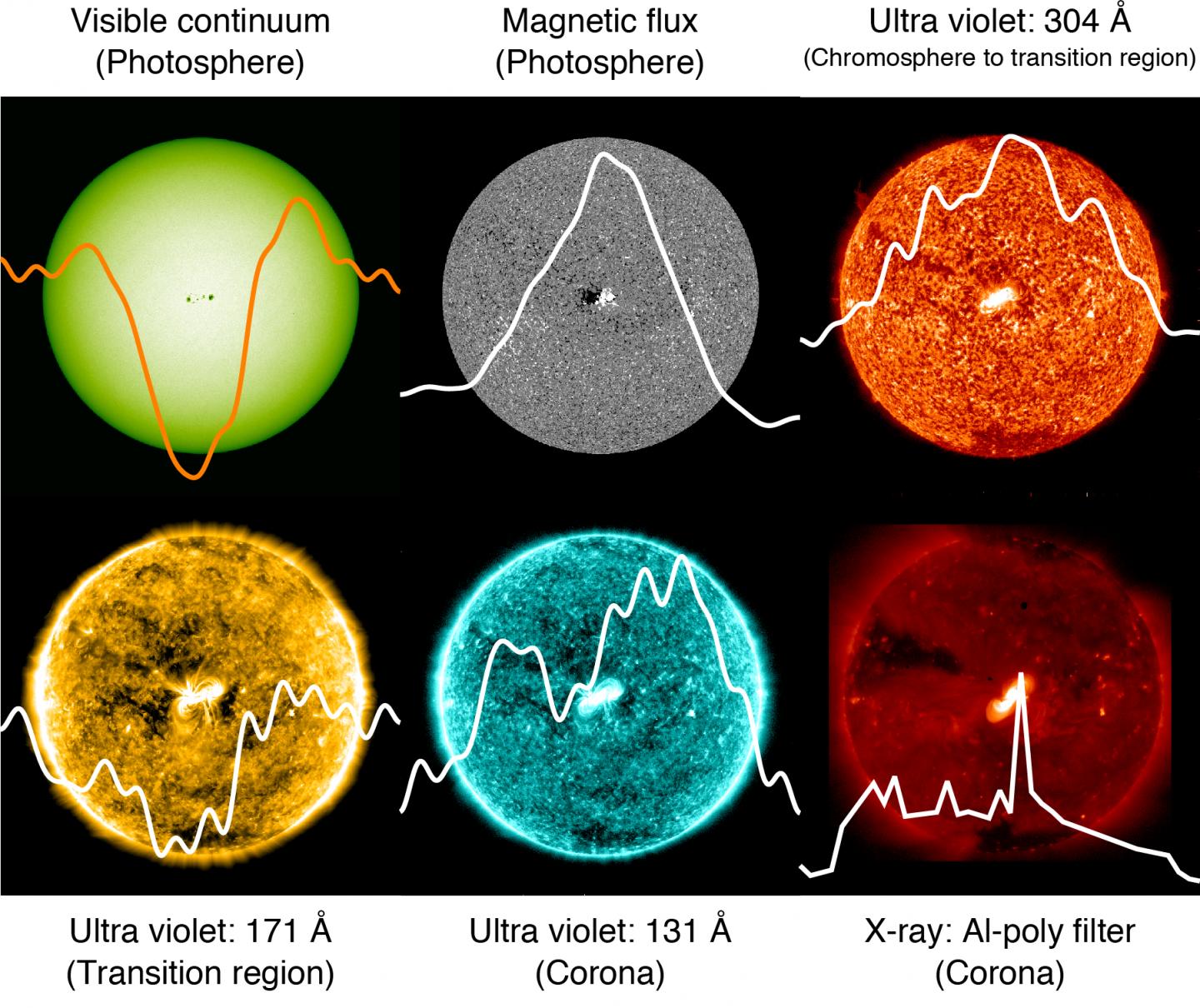 image: (Foreground) The time evolution of the total brightness of various solar emissions as a group of sunspots rotated across the surface of the Sun. (Background) Images of the Sun taken in the different kinds of emissions when the group of sunspots was near the middle of the Sun.