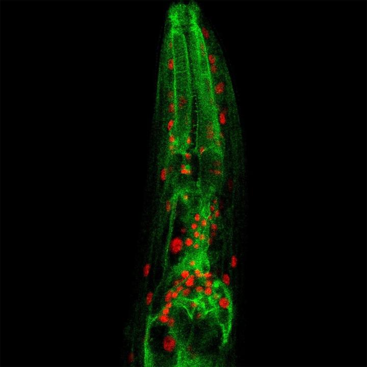 image: Microscopy image of a C. elegans worm (red: nuclei, in which NFYB-1 is present, green: lysosomes).