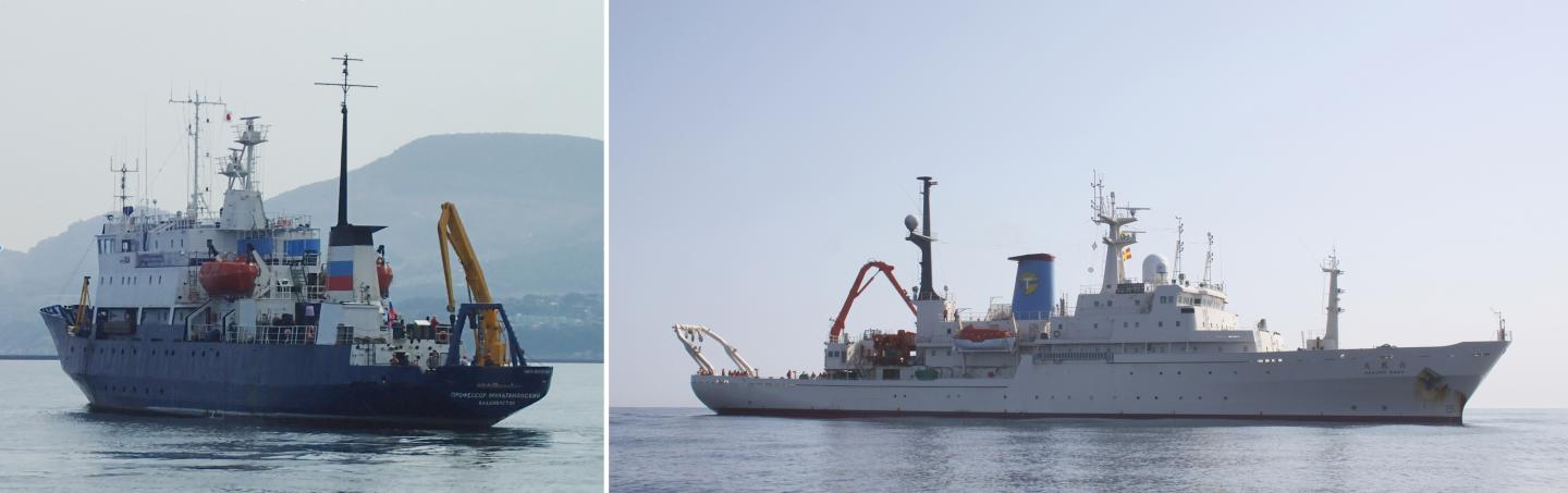 image: The research vessels Professor Multanovskiy of Russia and Hakuho Maru of Japan traveled to the marginal seas of Okhotsk and Bering to conduct the survey. (Photo provided by Jun Nishioka).