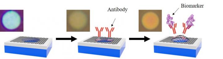 The research team, therefore, made a trampoline structure in which the unevenness of the substrate was covered with a graphene sheet, as a suspended structure of graphene which could withstand the solution treatment, and were able to modify graphene with an antibody molecule. The surface of the graphene was functionalized with an antibody molecule to provide the ability to recognize a molecule, and an ultrasensitive biosensor which could specifically detect a biomarker was able to be produced. A light detection technique unique to the research team was used as a technique for detecting a biomarker bound to the surface of the graphene. In a gap of 1 micrometer or less between the suspended graphene and the semiconductor substrate, color is changed depending on the length of the gap by the interference action of light. Using this effect, the appearance of a molecule adsorbed to suspended graphene in a test solution was revealed by changes in color. According to the biosensing technique developed this time, it is expected that sensitivity per unit area will be improved to 2000 times that of conventional sensors.