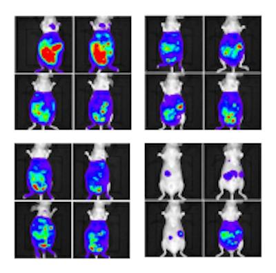 image: Imaging results showing a representative set of mice from each group three weeks after treatment. Top left, saline. control. Top right, artificial enzyme alone control. Bottom left, tagging agent alone. Bottom right, acctual treatment -- reactively functional RGD with the glycosylated metalloenzyme. Imaging shows much less tumor growth in the mice treated with the real therapy.