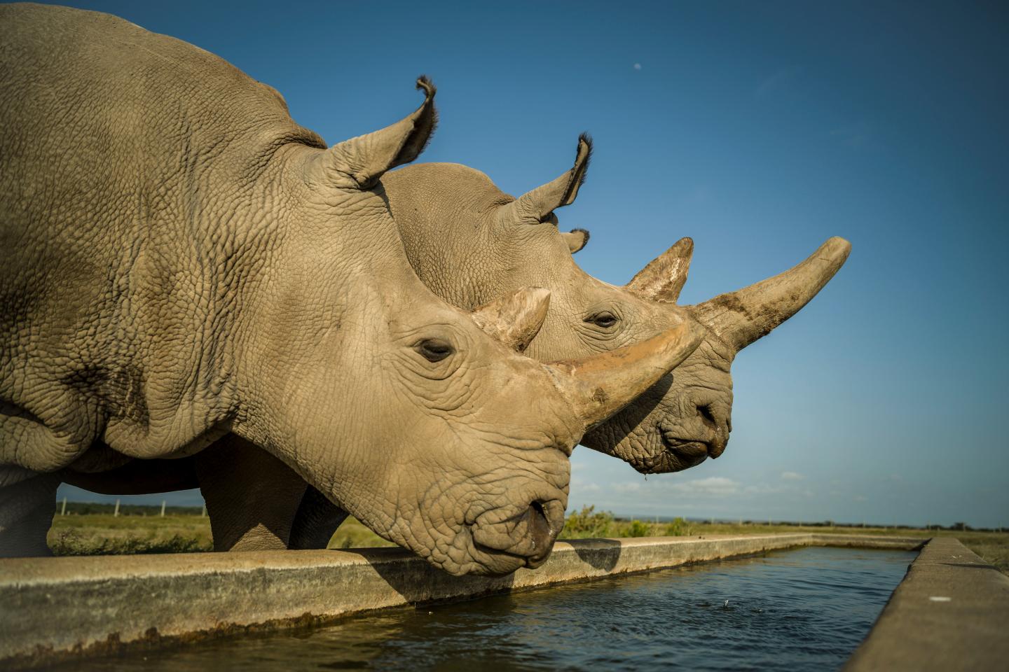 image: Najin (left) and Fatu (right) are the last two northern white rhinos on the planet. This photo was taken on Ol Pejeta Conservancy in their 700-acre enclosure.
