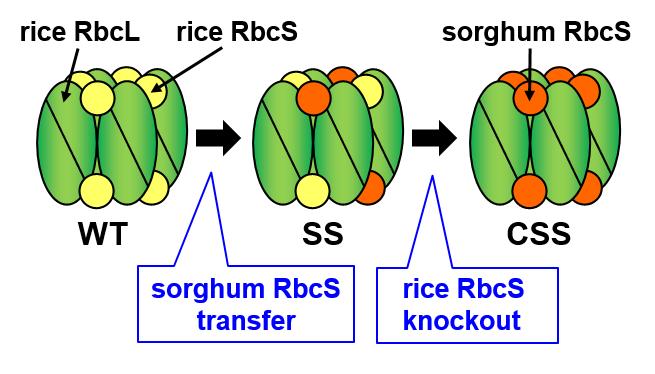 In this CSS line (sorghum RbcS transferred/rice RbcS knocked out), the rice RbcS was completely replaced by sorghum RbcS, producing hybrid Rubisco. This approximately doubled the catalytic rate to that which is equivalent to C4 plants (Figure 2). Although many researchers have been able to improve Rubisco's catalytic characteristics, there have been no examples of such a large increase being achieved. Furthermore, CSS line plants demonstrated a higher photosynthetic rate than unmodified (wild type) rice under high CO2 conditions, even though the amount of Rubisco in their leaves was over 30% less.