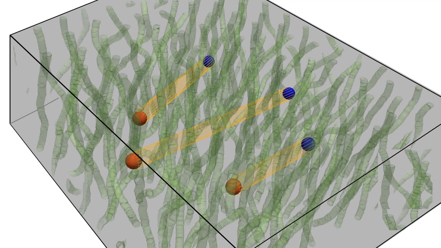 image: This image shows a 3D superinsulator, in which vortex condensate (green lines) squeezes the electric field lines connecting charge-anticharge pairs (red and blue balls) into the electric strings (orange strips). These strings tightly bind these charge-anticharge pairs, completely immobilizing them, so electric current cannot be produced.