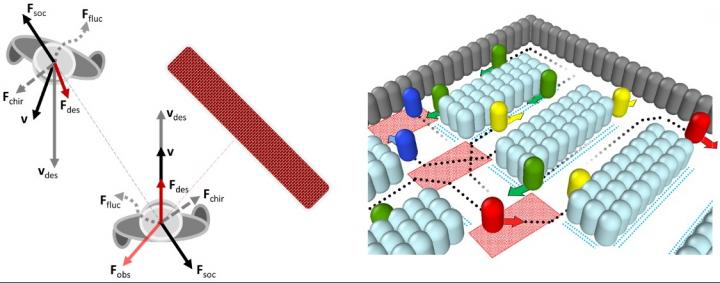 image: Left: Social forces exerted on an individual shopper. Right: A fragment of the supermarket model