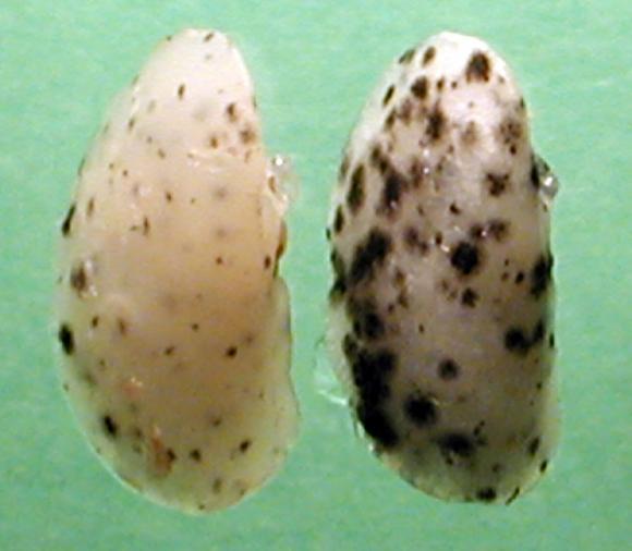 Dysregulation of the protein CHI3L1 allows melanoma (black specks) to spread to the lungs of mice. CHI3L1 was relatively unchecked in the lung on the right, compared to the lung on the left, which had much less spread of the cancer. Credit Elias lab/Brown University