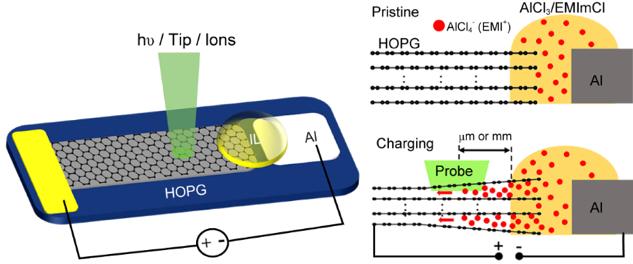 Based on UHV compatible ionic liquid (IL) electrolyte and well-defined electrodes, a planar Al/HOPG model battery which is composed of Al foil, HOPG flake and IL electrolyte in between has been designed for the following operando surface analysis (Figure 1 left). The model battery performs the same electrochemical behaviors as the real one. Furthermore, the diffusion length of the intercalated ions within HOPG model electrode can reach to millimeter. Thus, the electrochemical process can be directly probed on the open and clean electrode surface (Figure 1 right).
