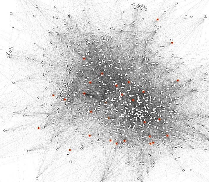 image: The red nodes denote the influencers chosen by their model. The model tends to choose influencers with relatively larger number of connections and also those belonging to different sub-components of the network.