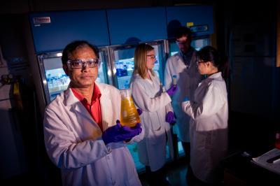 Conventional wisdom says that the scaffold in an important class of biological molecules called glycoconjugates is essentially inert. Work by Michigan Tech chemist Tarun Dam suggests otherwise, which could open the door to new and more-effective drugs. Dam is holding a container of lectin, a key component of his team's research.