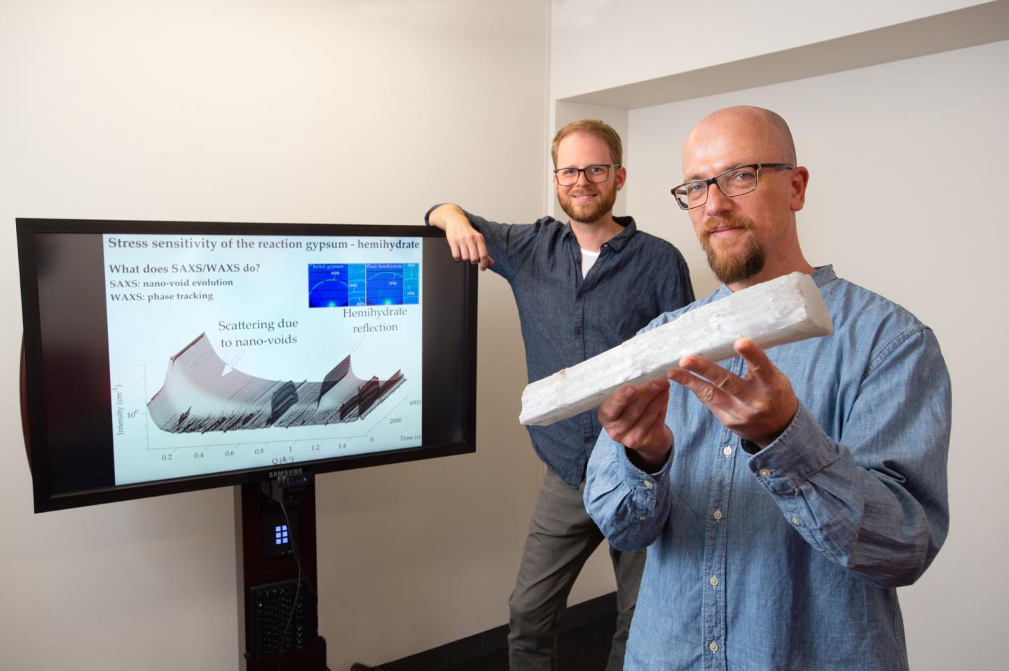 image: Dr Oliver Gaede (left) and Dr Christoph Schrank has used experimental x-ray techniques to gain fundamental insights into how gypsum dehydrates under pressure and the processes that create earthquakes.