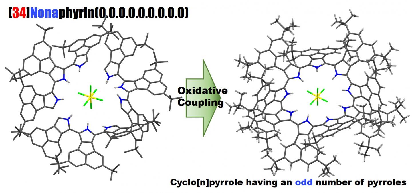 Porphyrins, which are well-known natural porphyrin molecules, e.g. heme and chlorophyll, are attractive for use in practical materials because of the easy optimization of their optical and physical properties by conjugation expansion and functionalization. In 2002, Sessler reported the first synthesis of cyclo[n]pyrrole (n: the number of pyrrole rings). Peripheral alkyl-substituted cyclo[8]pyrroles were obtained via an oxidative coupling of 2,2'-bipyrrole, and showed an intense L band at ca. 1,100 nm.