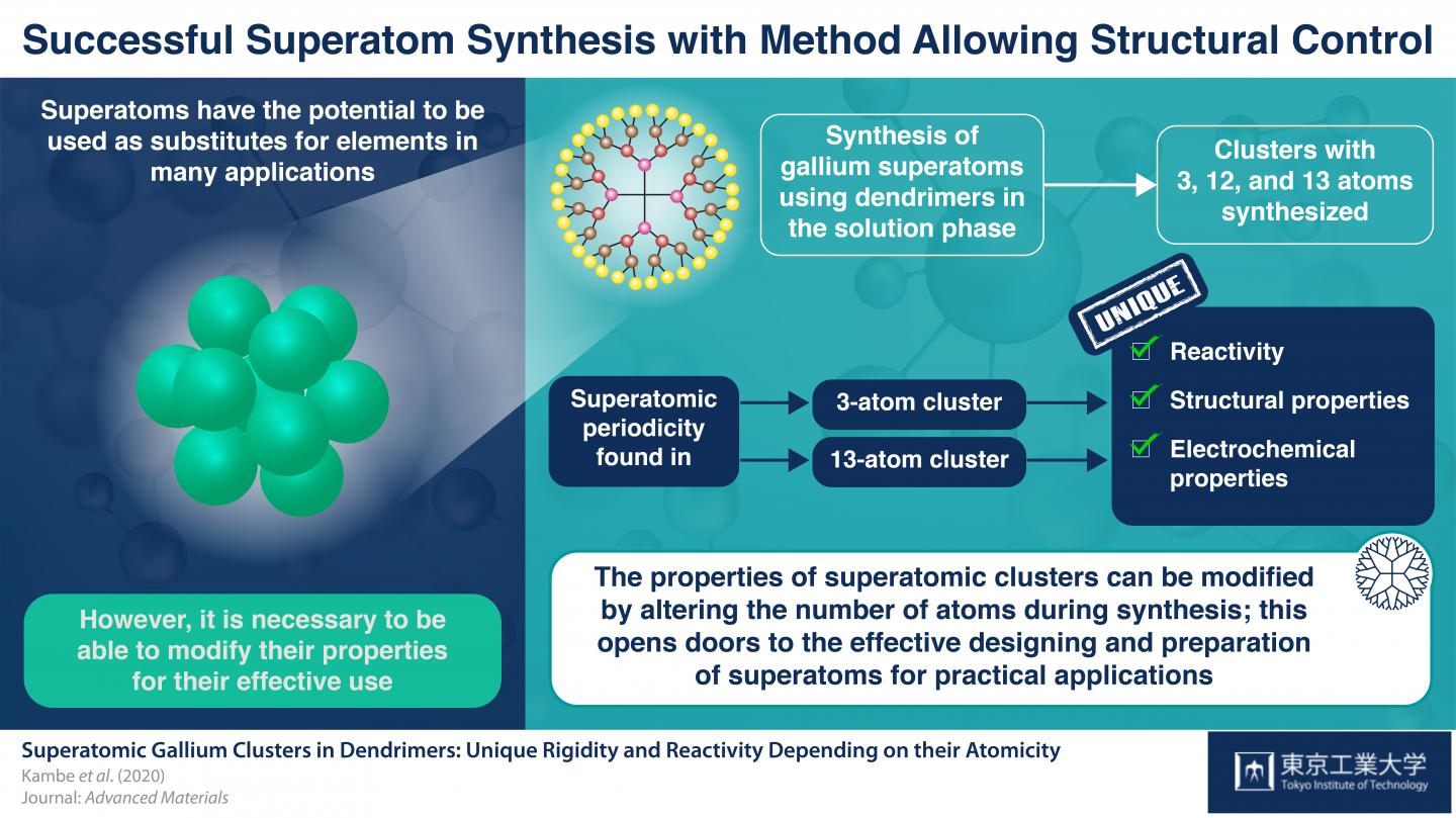 In a recent study, scientists from Tokyo Tech and ERATO Japan Science and Technology, led by Dr Tetsuya Kambe and Prof Kimihisa Yamamoto, fabricated clusters of the element gallium (Ga) in solution to demonstrate the effects of changing the number of atoms in a cluster on the properties of the cluster. The team synthesized Ga clusters of 3, 12, 13 and other numbers of atoms using a specialized superatom synthesizer. To characterize and analyze the structural differences among the synthesized clusters, transmission electron microscopic images were captured and calculations were performed using computation tools.