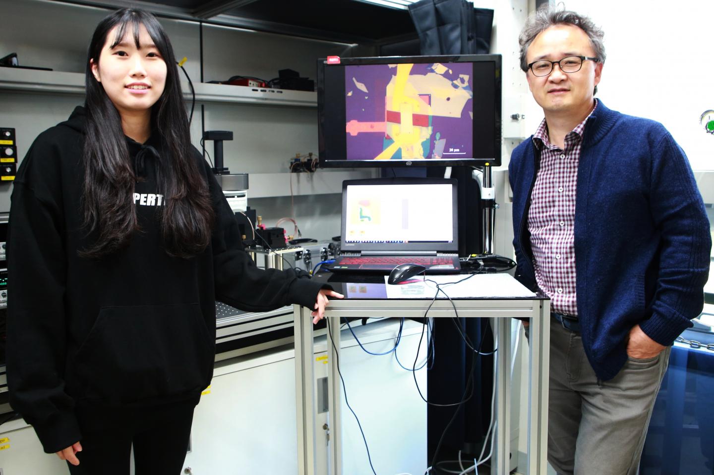 image: Professor Jong-Soo Lee (right) with Min-Hye Jeong (left), a student from the integrated Master & Doctorate program, next to their observation devices for the experiment