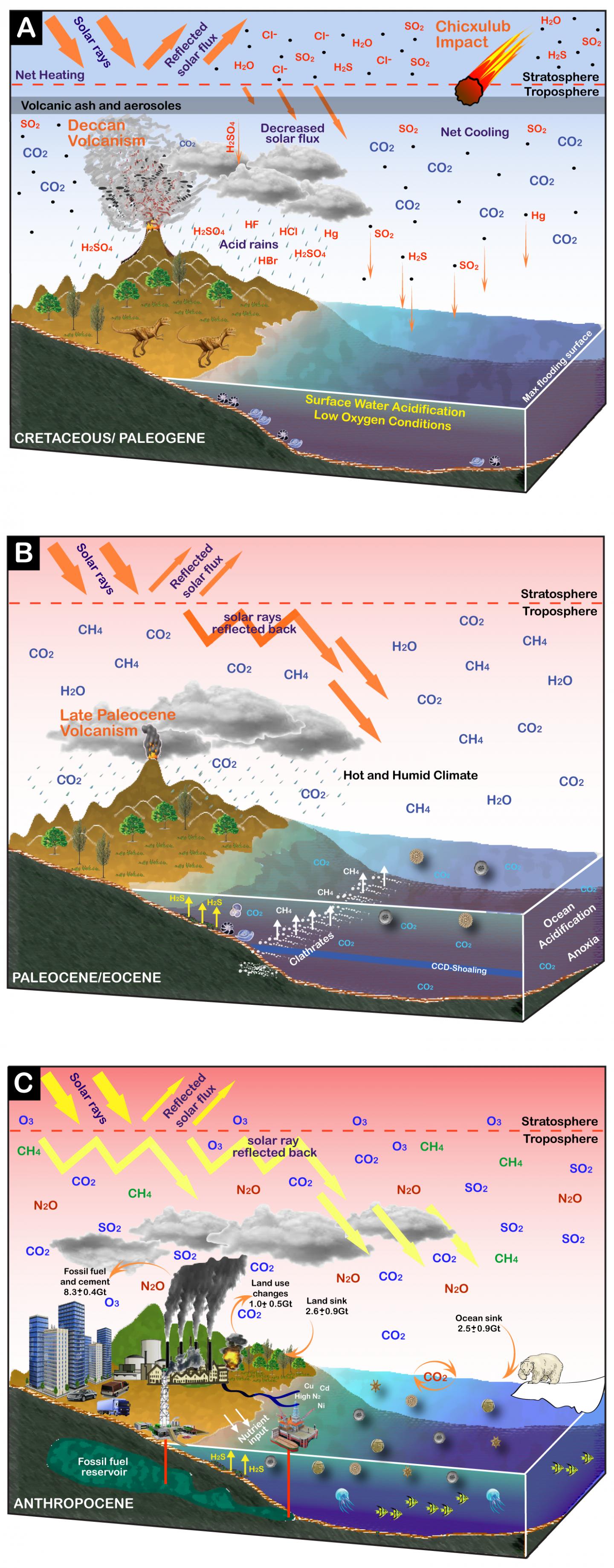 image: Illustration of the KPB mass extinction, the PETM, and Anthropocene climate warming. (A) During the latest Maastrichtian environmental devastation is mainly due to volcanism (ash, aerosols and greenhouse gases), resulting in rapid climate changes, acid rains and ocean acidification that is exacerbated by the Chicxulub impact, thus impeding calcification by marine plankton at the base of the food chain. (B) During the latest Paleocene to early Eocene: Gradual climate warming preceding the PEB is attributed to North Atlantic Igneous Province volcanism (NAIP), but the rapid warming of 5 °C (PETM) is linked to methane hydrates released from continental shelves resulting in acid rain on land and ocean acidification (~170,000 years). (C) During the Anthropocene large inputs of greenhouse gases (CO2, SO2, N2O) linked to human activities and fossil fuel burning leads to rapid warming and ocean acidification at a rate exceeding those at the PETM and KPB by orders of magnitude. Global carbon budget data for the Anthropocene from Le Quéré et al. (2013). Illustration modified from Glikson (2014).
