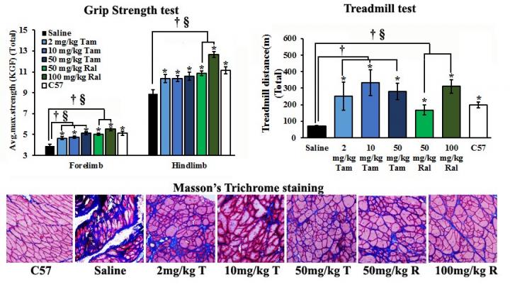 Other benefits were also observed. Control mice showed progressive muscle degeneration and regeneration in the diaphragm, accompanied by increasing fibrosis and infiltration, as well as significant impairment in respiration. Both tamoxifen and raloxifene eliminated focal infiltration and reduced the extent of fibrosis in the diaphragm, increased mass, and improved breathing ability. "Both treatments also improved bone density in the tibia and femur, potentially reducing the risk of fracture, a major threat to patients as MD progresses," added co-author Bo Wu, PhD, a research scientist at the McColl-Lockwood Laboratory for Muscular Dystrophy Research, Neuromuscular/ALS Center, Department of Neurology, Atrium Health's (formerly Carolinas HealthCare System's) Carolinas Medical Center, Charlotte (NC).