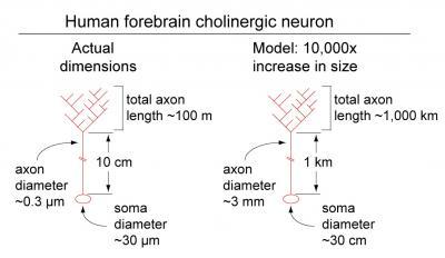 This shows actual and magnified dimensions of a human cholinergic neuron. (Top) Total length of neuron branches if placed end to end; (middle) length of central "pipeline" connecting the branches to the cell hub (soma; bottom).