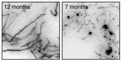 This shows the cholinergic neurons of a healthy mouse at 12 months of age (left) compared to those of a mouse with "Alzheimer's disease" at 7 months (right). The diseased neurons are fragmented and show clumps of what may be cellular debris.