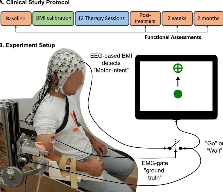 The trial involved training stroke survivors with limited movement in one arm to use a brain-machine interface (BMI), a computer program that captures brain activity to determine the subject's intentions and then triggers an exoskeleton, or robotic device affixed to the affected arm, to move in response to those intentions. The device wouldn't move if intention wasn't detected, ensuring subjects remained engaged in the exercise.