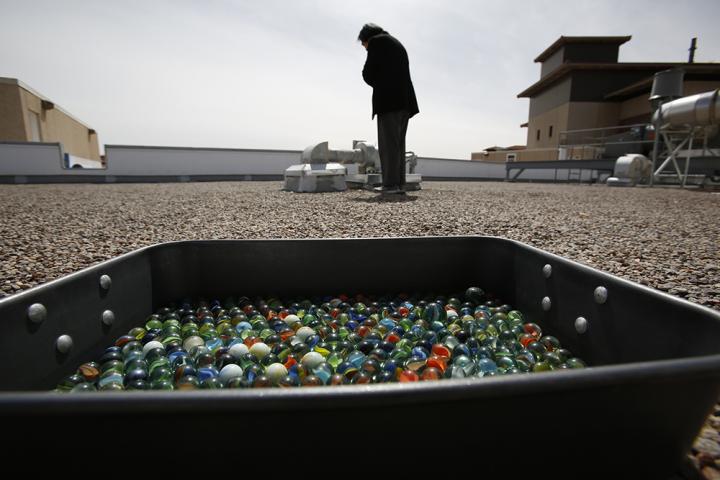 image: A tray of marbles sits on the roof of the Biology Building on the campus of The University of Texas at El Paso. Trays like this were used to collect dust as part of a study by UTEP faculty and students to determine how microinvertebrates were carried across vast expanses of desert by wind. The marbles mimic the rolling surface of desert terrain. Blowing dust skims right over most surfaces but will occasionally become lodged in gaps. Researchers took this dust and rehydrated it to determine if microinvertebrates in dormant, developmental stages were present.