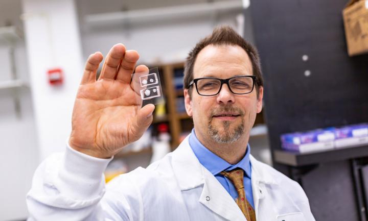 image: Dr. David Schmidtke, University of Texas at Dallas professor of bioengineering, displays a microfluidic device in his lab at UT Southwestern Medical Center. Schmidtke uses microfluidic devices to fabricate tiny strands of collagen called fibrils.