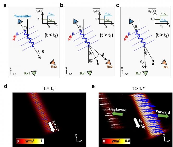 image: a, an incoming electromagnetic wave travels in an unbounded medium with an isotropic permittivity. b, by rapidly changing the permittivity of the medium in time from isotropic to an anisotropic tensor (with the x component of permittivity smaller than its z component) a temporal boundary is introduced producing forward and backward waves (equivalent to transmission and reflection at the interface between two media in the spatial domain). In this situation the direction of the wave vector remains the same while the energy propagation changes its direction following the direction of the Poynting vector S, eventually reaching receiver 2 (Rx2). c, a similar approach can be applied by properly engineering the temporal function of permittivity to allow the transmitted electromagnetic wave to be re-directed towards Rx1. d-e, Snapshots of the simulation results for the power distributions at times before and after the permittivity is changed from isotropic to anisotropic in real time, respectively, demonstrating how the energy changes its direction: temporal aiming.