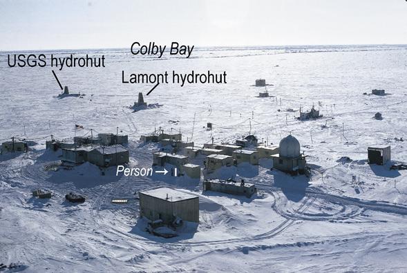 image: Aerial view of T-3 Ice Island science encampment in spring 1967 at ~79°N, with person in center for scale. The USGS heat flow data and sediment cores were acquired in the USGS hydrohut on the left.