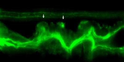 This is a segment of the mutant intestine (3.5 day old fish, lateral view of the intestine) in a transgenic mutant zebrafish that expressed the green fluorescent protein tagged to a peptide that binds to actin in epithelial cells. Invasive cells with protrusions expand out in to the surrounding tissue stroma (arrows). The green structure on the top of the movie frame is the kidney duct. The intestine is below the kidney duct. The actin-rich protrusions are the invadopodia.