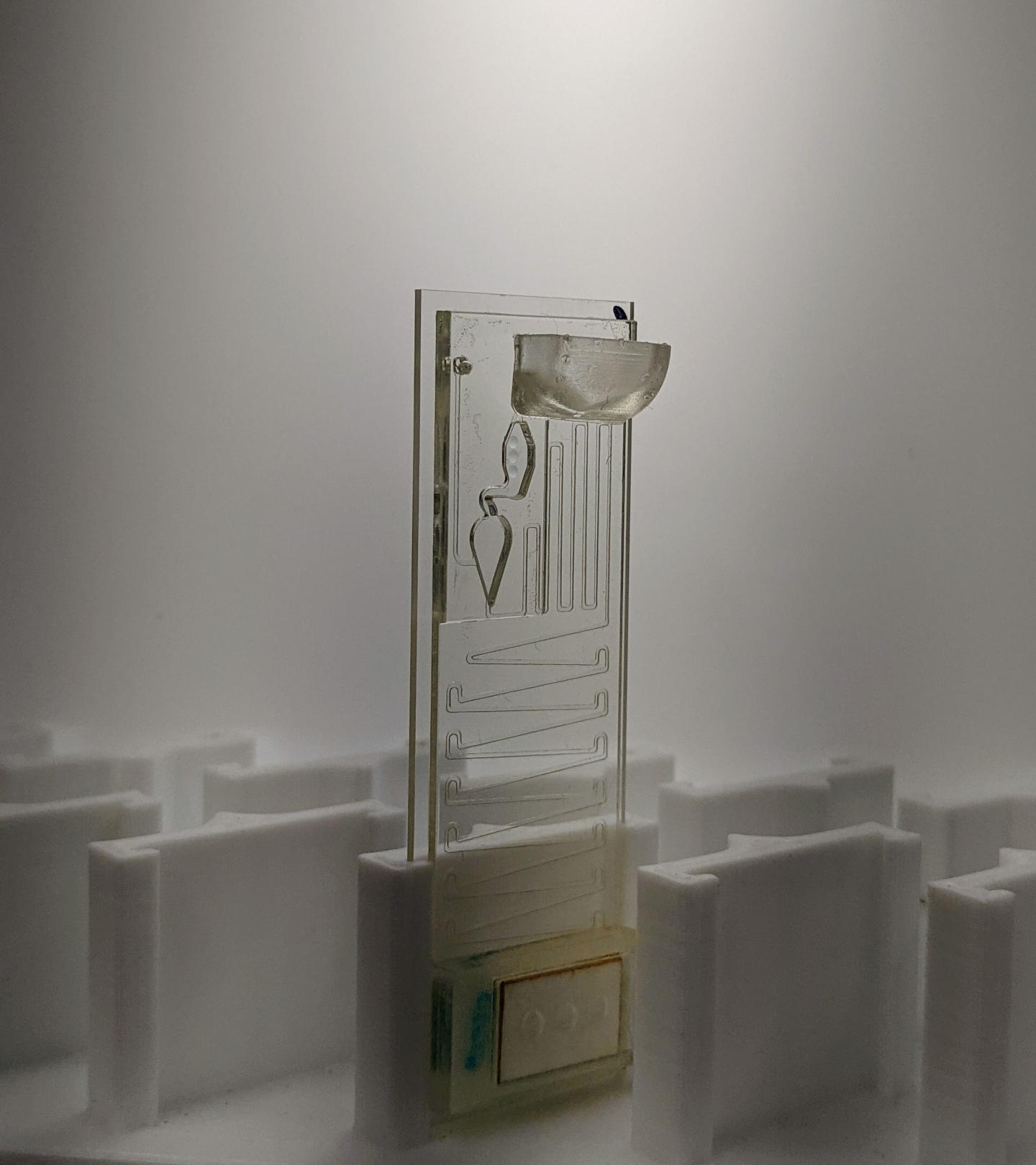 image: This point-of-care device uses the physics of fluids to draw a few drops of blood and biomedical lubricant through its components to test for COVID-19 antibodies and biomarkers without the need of any electricity.