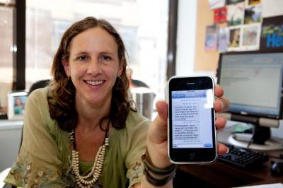 This image shows a smart phone with a sample Text2Quit message held by lead researcher Lorien Abroms at the George Washington University.