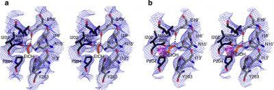This shows: (a) Stereo view of protein atoms neighbouring one ethanol molecule (orange) in the co-crystal structure with GLIC F14′A. Dotted lines indicate putative hydrogen bonds with the backbone carbonyl of N200 in the left-hand subunit (dark grey) and with N15′ and E19′ in the right-hand subunit (light grey). (b) Protein atoms neighboring one molecule of 2-bromoethanol (orange) in the co-crystal structure with GLIC F14′A, displayed as in a. Sigma-A-averaged electron density surrounding ethanol and 2-bromoethanol are contoured at 1.0 σ (blue mesh) and bromine-anomalous map is contoured at 5.0 σ (magenta mesh).