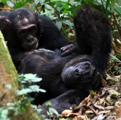 This image shows the Sonso group in the Budongo Forest, Uganda: Two male chimpanzees are grooming each other, a very intimate behavior based on trust.