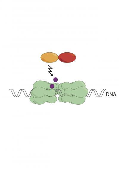 The binding of Rif1 (red) to the PP1 enzyme (orange) inactivates DNA replication by removal of the molecular "tags" (violet) to the replication complex (green).