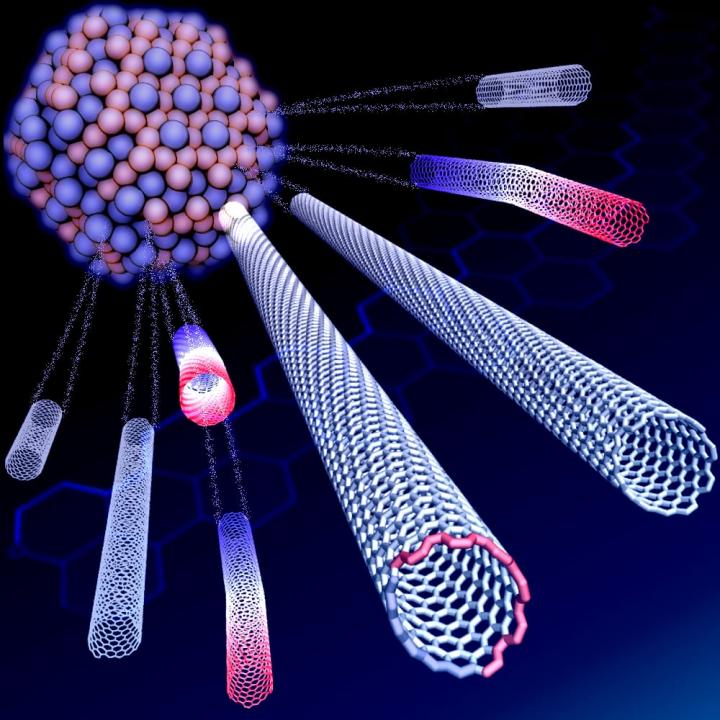 image: Rice University scientists have decoded the unusual growth characteristic of carbon nanotubes that start out as one chirality but switch to another, resulting in nearly homogenous batches of single-walled nanotubes. The nanotubes grow via chemical vapor deposition with a carbon-tungsten alloy catalyst.