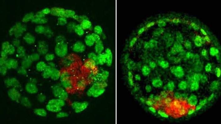 image: A normal 4-day-old mouse embryo (L) and an embryo of the same age that has been manipulated to contain maternal chromosomes only (parthenogenote). At this stage, the embryos (blastocysts) appear similar, but the parthenogenote will soon die, underscoring the importance of inheriting imprinted genes from both parents. Different cell types are stained green or red.