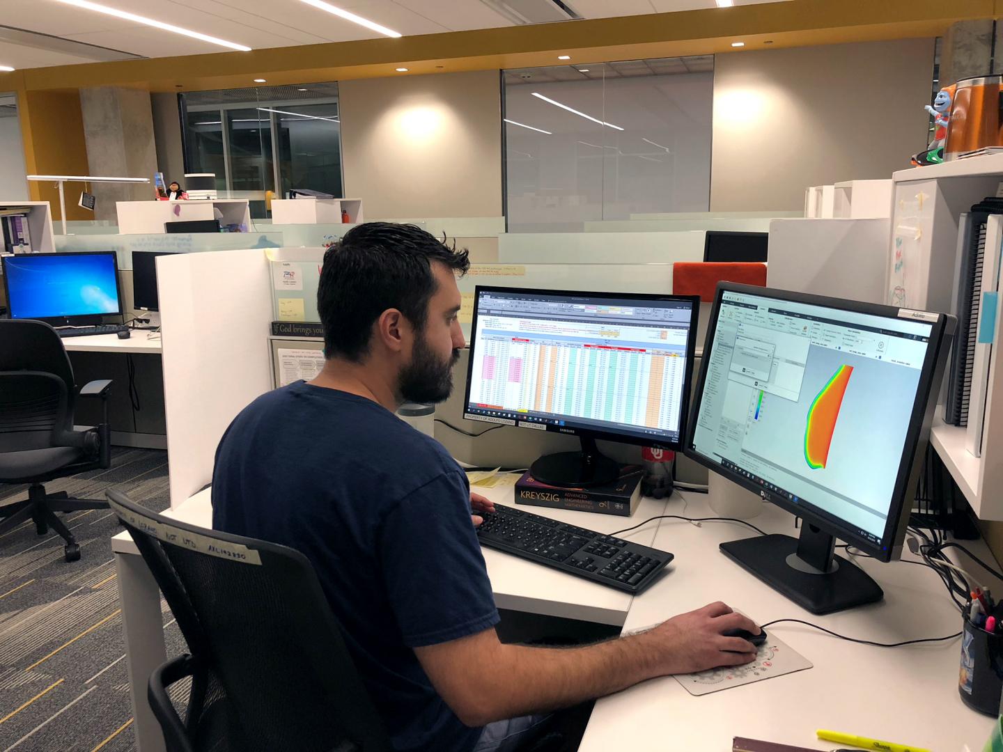 image: Adolfo Lozano PhD'20 works on a proof-of-concept computer model of the thermal properties of breast cancer. He and other UT Dallas researchers aim to improve digital thermal imaging as a tool for monitoring cancer and its treatment.
