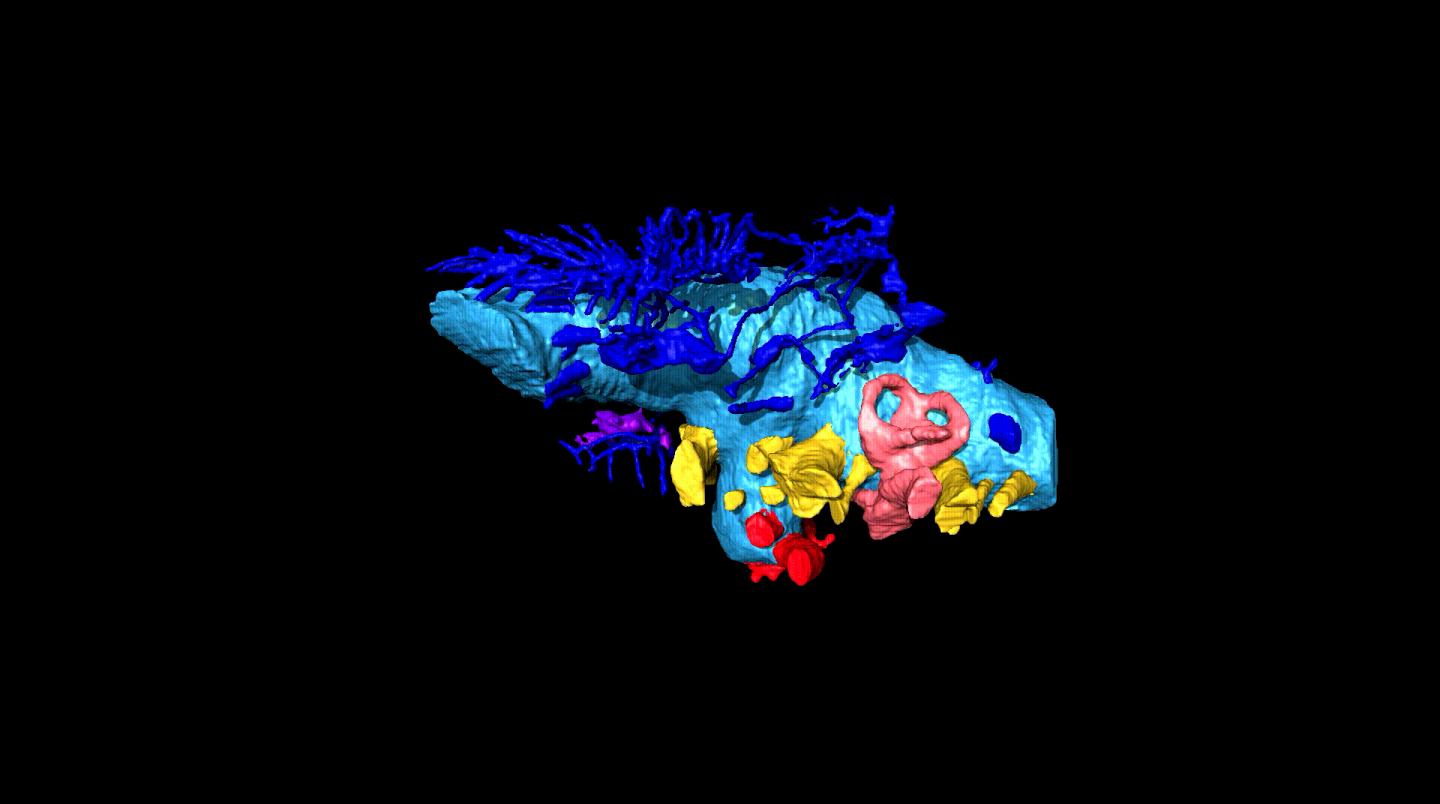 image: Three-dimensional virtual reconstruction of the braincase of the ankylosaur Bissektipelta archibaldi. Bones are semi-transparent and the internal contents of the endocranial cavity are seen. Pink - inner ear, yellow - nerves, red - major arteries, blue - veins and small arteries, light blue - endocranial cast.