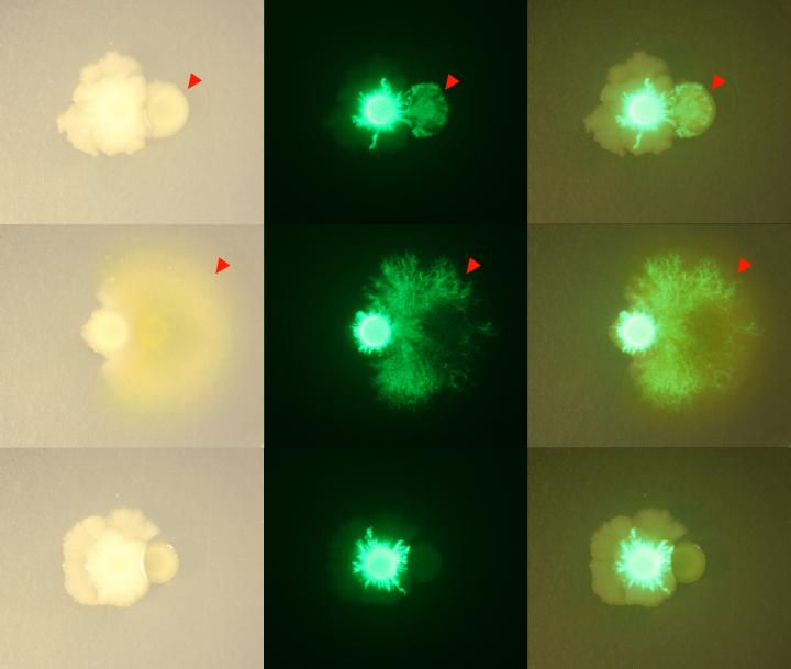 image: Bacillus bacteria, marked with green fluorescence, changed its growth pattern around other members of the THOR community, spreading around and over other bacteria.