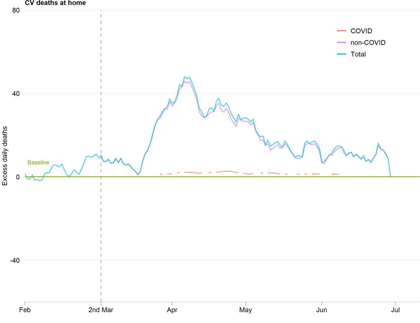 image: There are three graphs that help explain this story. They show the location of excess daily deaths: at home, in care homes and in hospital from February 2020 through to the end of June. Lockdown began on 23 March. Excess deaths at home and in care homes rise sharply from the middle of March - while excess non-COVID deaths in hospital fall.