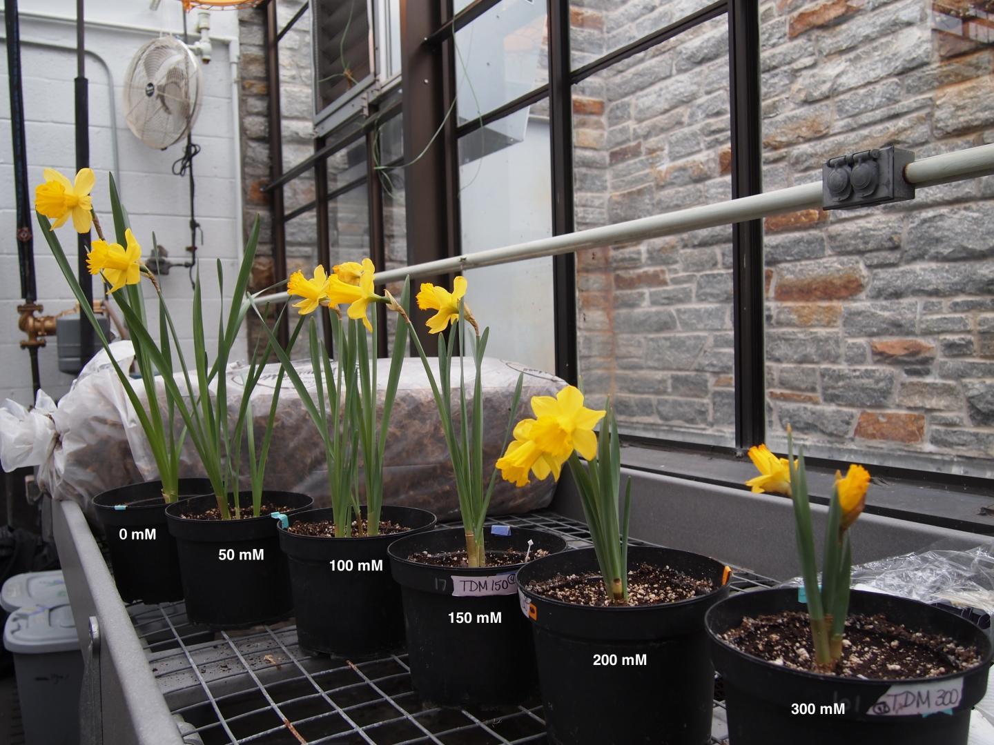 In the September 2014 issue of HortScience, Maren Veatch-Blohm, Douglas Sawch, Nicole Elia, and Dominic Pinciotti from the Biology Department at Loyola University, Maryland, presented a study of 'Tete-a-Tete', 'Dutch Master', and 'Ice Follies' daffodils. These three early to midseason cultivars are consistently ranked in the top five daffodils for sales and production. "Our previous research showed that moderate salinity (up to 50 mM NaCl) did not have an effect on growth or flower production of these three cultivars regardless of when salinity exposure began," noted lead author Veatch-Blohm. "In this study we wanted to determine levels of salinity these three cultivars could tolerate while maintaining visual quality."
