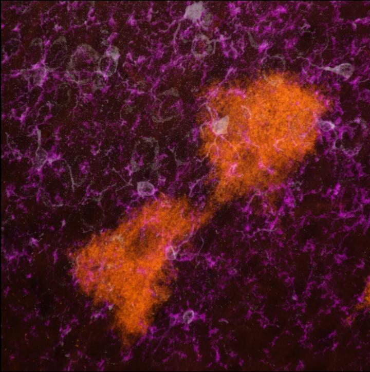 image: This is a 63X image from a TIGER mouse brain demonstrating release of CD9-GFP (orange) extracellular vesicles from astrocytes that are taken up by IBA1 (purple)/CD11b (white) neuroimmune cells called microglia.
