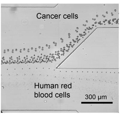 This image shows the beginning of separation stream separating cancer cells from red blood cells in the tilted-angle standing surface acoustic wave-based cell-separation device.