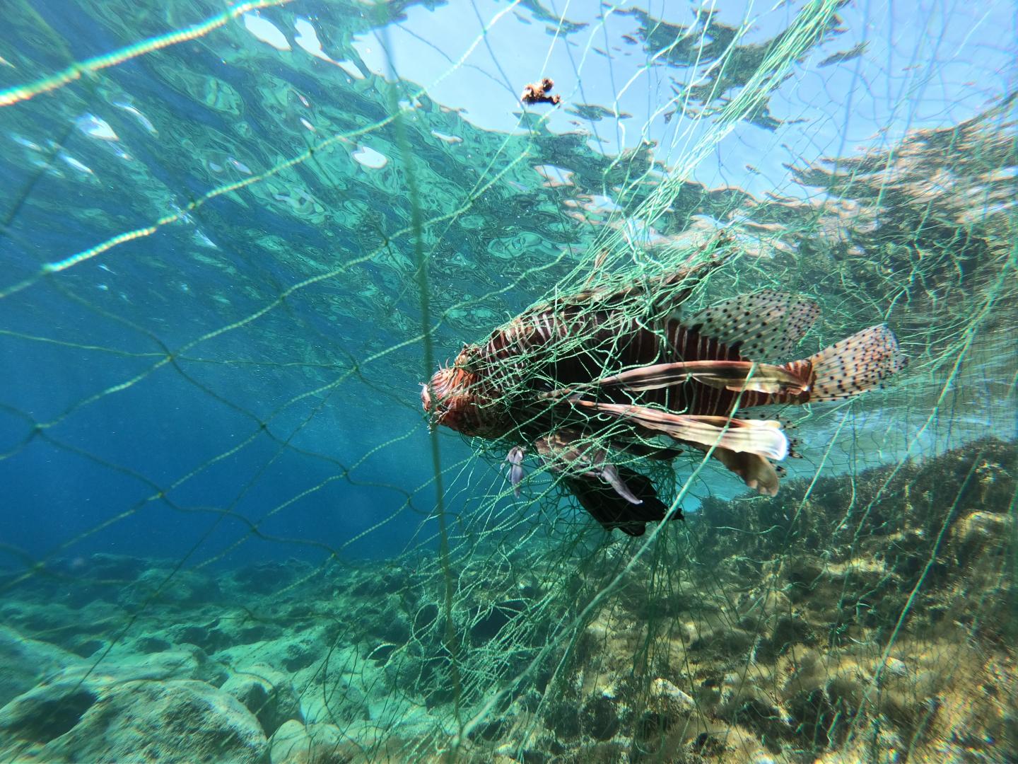 image: A lionfish (Pterois miles) entangled in a fishing net off the coast of Cyprus