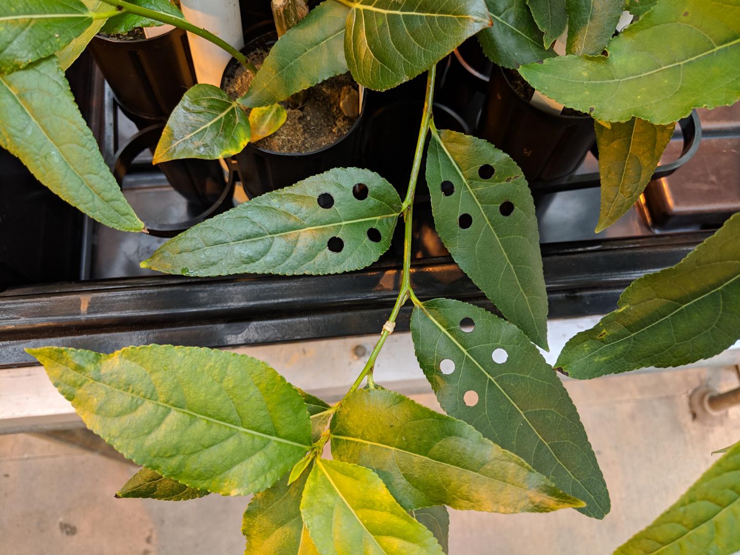 image: Black cottonwood trees with holes punched in the leaves. Holes are punched in leaves to collect tissue for the DNA extraction.