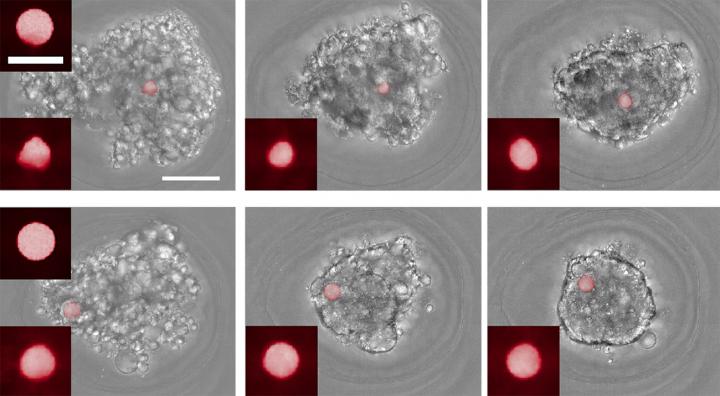 In another set of experiments, the researchers added the sensor spheres to preformed cellular masses to observe how the spheres were taken up into the mass. Some of the spheres had been treated with a collagen coating, which enables cells to bind with the sensors, while others were uncoated.