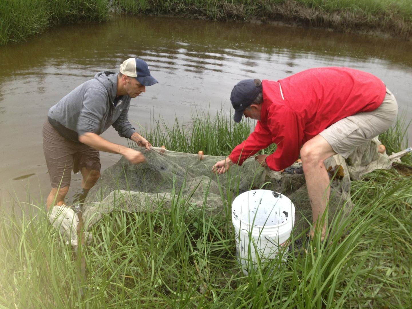 Joe Shaw, left, and Bruce Stanton seine for killifish at the Callahan Mine Superfund site in Maine.